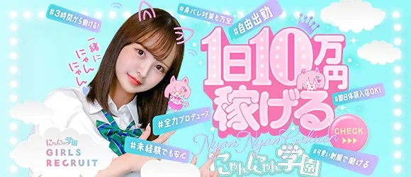 | 応募資格 | ▼募集年齢 18歳以上(高校生不可)~30歳 ▼にゃんにゃん学園の在籍平均年齢 🎀18~19歳:20% 🎀20~25歳:60% 🎀25~30歳:20% 完全業界未経験大歓迎! 在籍・出稼ぎ共に大歓迎です 収入を増やしたい、勤務地を変えて仕事したい方、個性を活かして自分らしく仕事したい方、目標を早く達成されたい方、自分に自信が無い方も是非お話だけでも聞きに来てくださいませ! あなたの稼ぎたい気持ちにしっかり寄り添えるのがにゃんにゃん学園です♪ ※18歳未満(高校生を含む)の応募はお断りします。 |