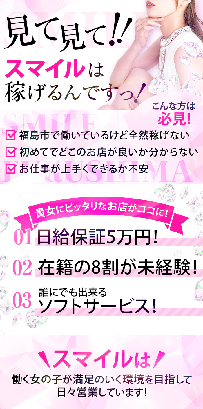 福島デリヘル集客率トップクラス!あなたの頑張り次第でお給料がUP!目指すは福島で一番働きやすいお店!地元で働くから顔出しができない…でも一日の最低保証は絶対必要…そんな貴女!必ず力になります!顔だしが出来なくても、Smileなら高額バック&日給保証50,000円!