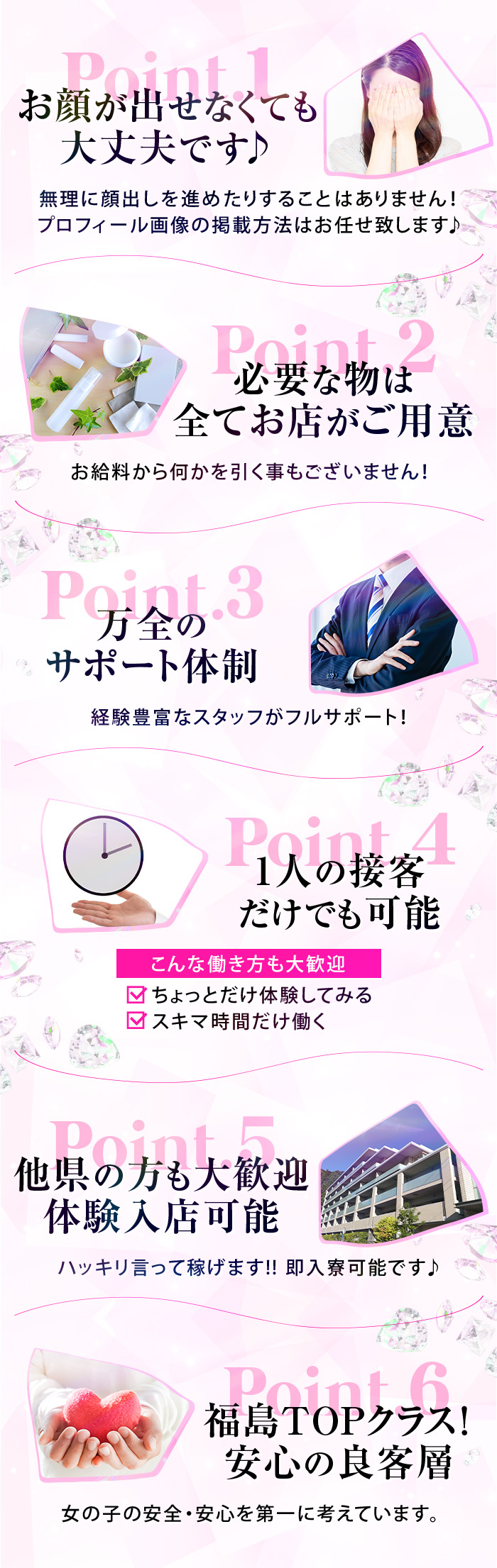自分に合ったライフスタイルでお仕事をしてもらう為に、女の子のお好きな時間でお仕事ができます!