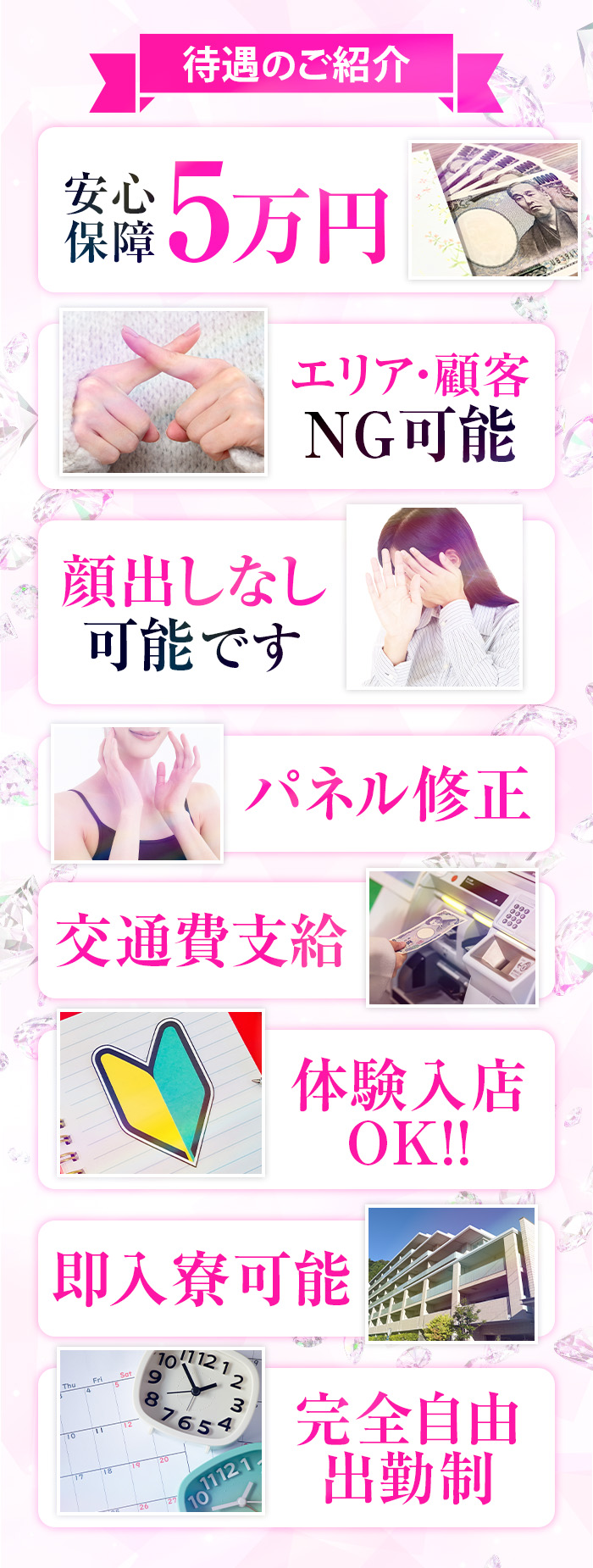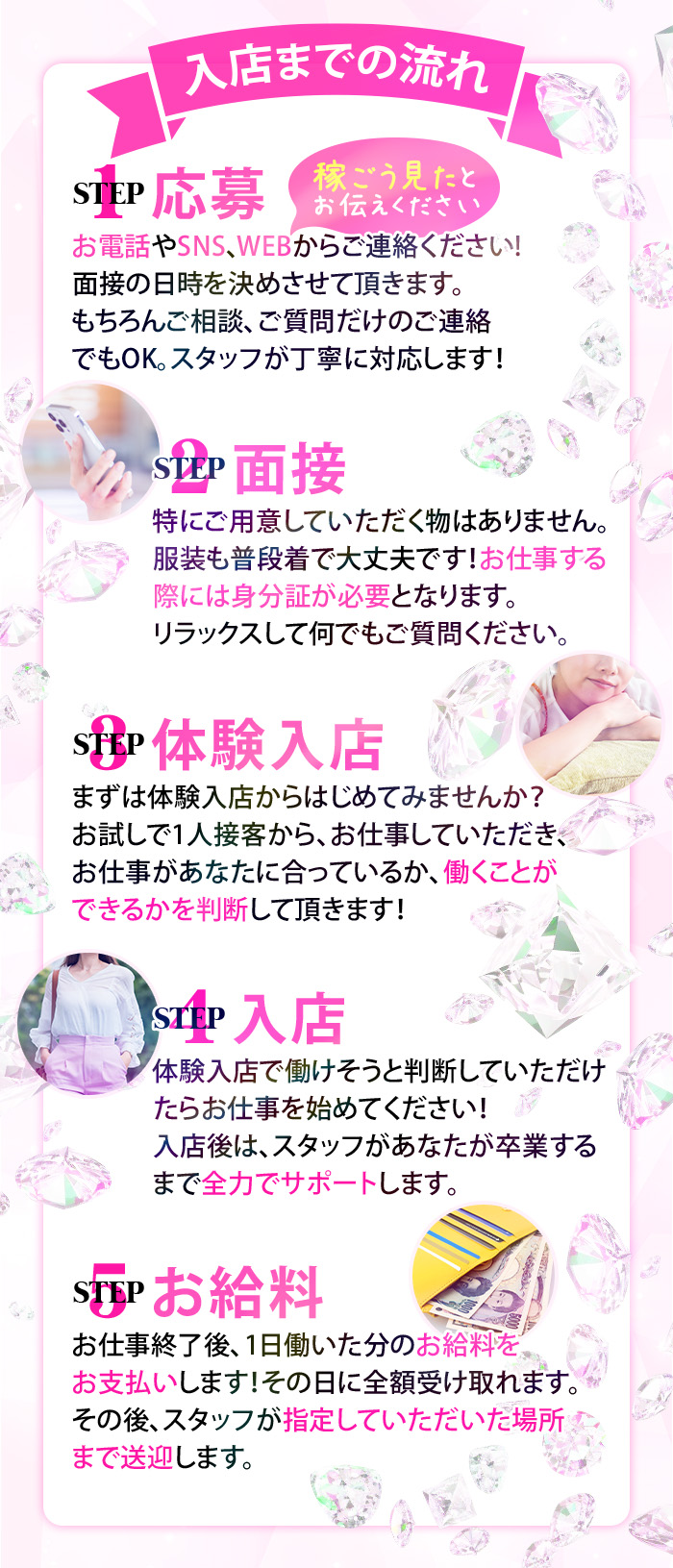 | 待 遇 | 未経験可 完全日払 体験入店 寮完備 自由出勤 ノルマ無し 入店祝金 交通費支給 制服貸与 託児所有 掛持OK 最低保障 専用出入口 備品支給 取材手当 送迎あり 個室待機 アリバイ会社 自宅待機 Wi-Fi完備 タトゥーOK 傷跡OK 実技講習無し 出張面接可 オンライン面接可 生理休暇 生理中勤務可 社会保険あり 性病検査 駐車場あり 女性スタッフ |