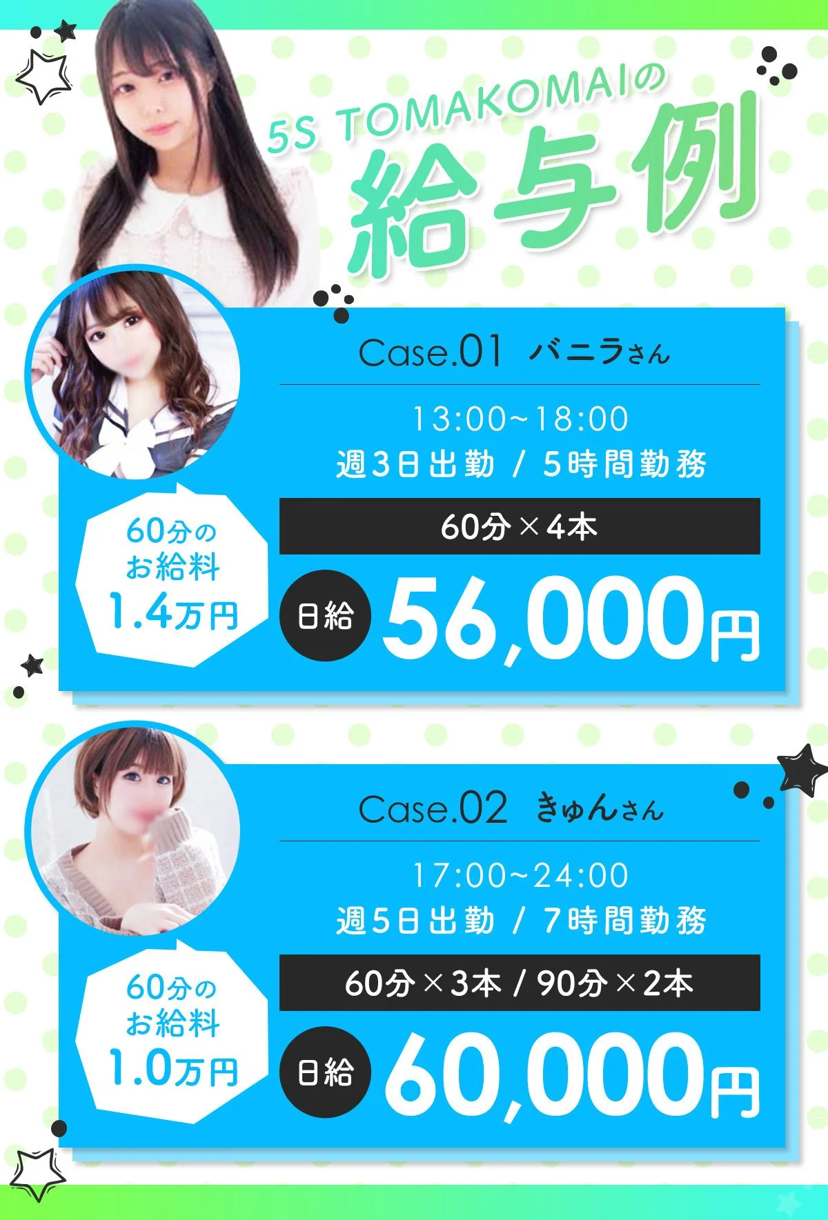 | 勤務日 | 完全自由出勤制度月1日からOK!短期/長期どちらでも構いません。 |