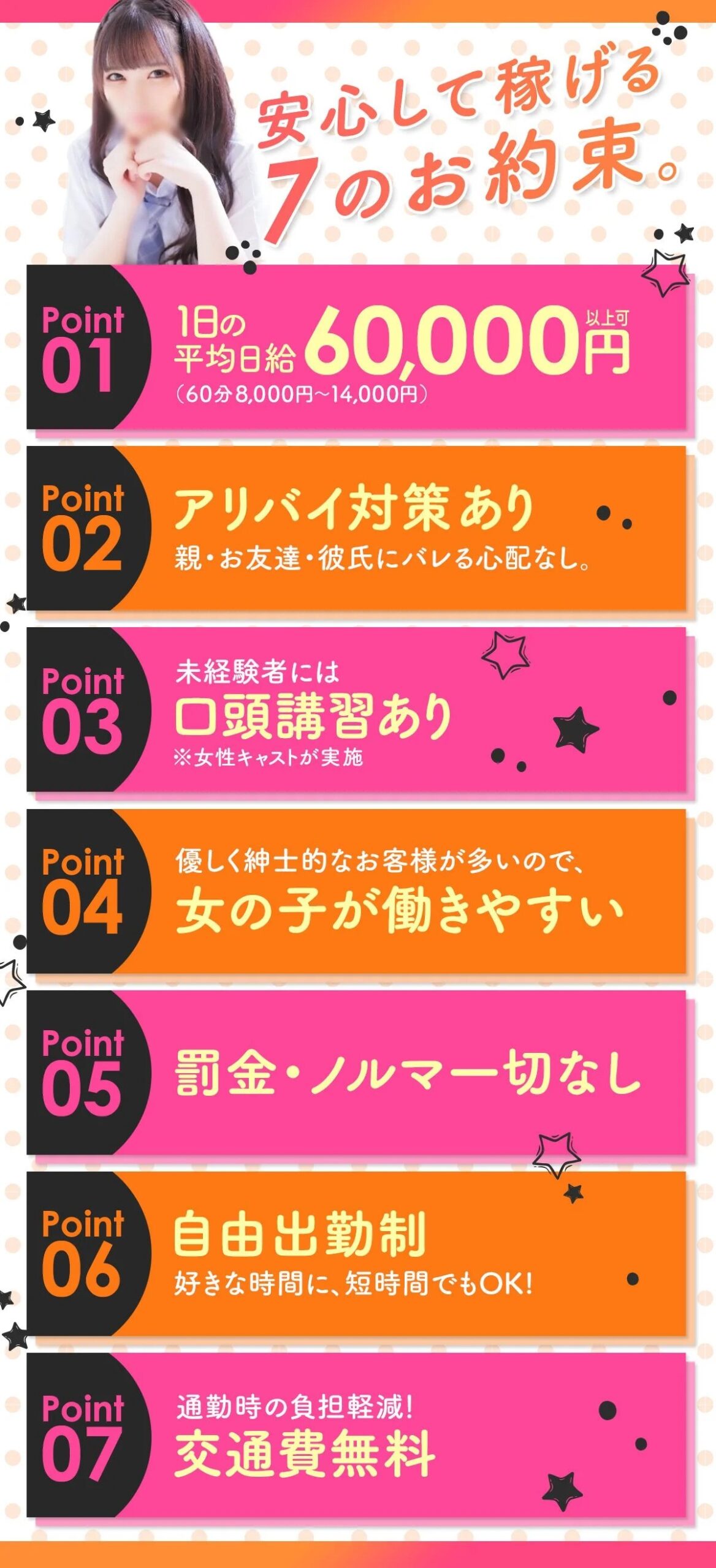 | 勤務時間 | 営業時間:13時~翌3時(日曜:13時~翌1時) 上記の間であればお好きな時間で勤務可能1日2時間~勤務OK! |